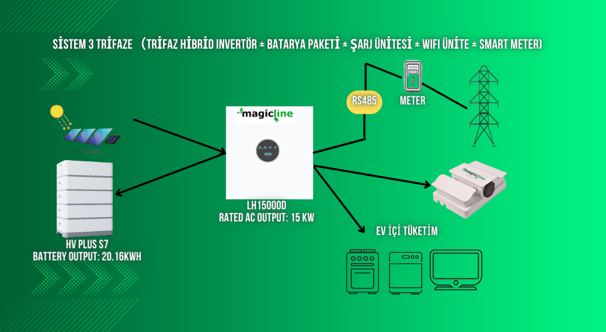 Bu sistem, yüksek kapasiteli konutlar ve ticari tesisler için geliştirilen, hem şebeke bağlantılı hem de bağımsız çalışabilen trifaze hibrit enerji çözümüdür. Güneş panellerinden elde edilen enerji, Magicline LH15000D trifaze hibrit invertör aracılığıyla yönetilir. Üretilen enerji, HV PLUS S7 batarya paketi (20.16 kWh kapasite) içinde depolanabilir veya doğrudan ev içi tüketim ve şarj ünitesine yönlendirilebilir. Sistem ayrıca, akıllı ölçüm cihazı (Smart Meter) ve RS485 haberleşme protokolü sayesinde şebeke ve enerji akışını gerçek zamanlı izleyebilir. Bu yapı, hem enerji verimliliğini maksimize eder hem de kullanıcılara tam kontrol ve otomasyon olanağı sunar.